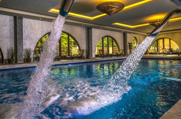 Beltéri medence: 27 °C-os, 18m x 9m méretű, úszásra alkalmas, beltéri